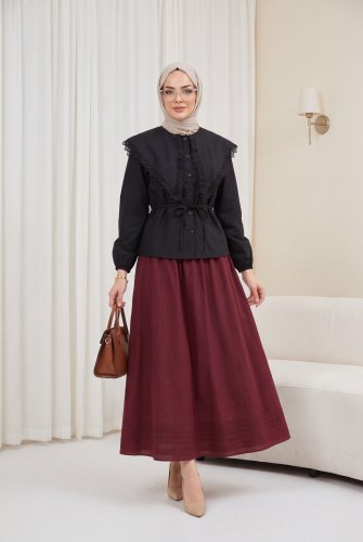 Dantelli Geniş Yakalı Bağcıklı Kolu Lastikli Poplin Gömlek Siyah
