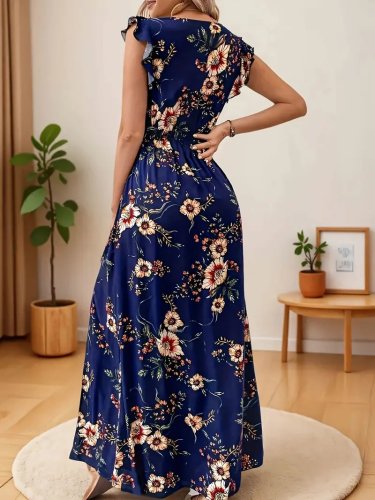 • Kadın kısa kollu v yakalı yırtmaçlı çiçek desenli süprem elbise