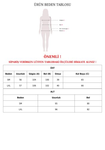 • Modelin Ölçüleri: Boy:165, Kilo:55, Göğüs:90, Bel:72, Kalça: 100