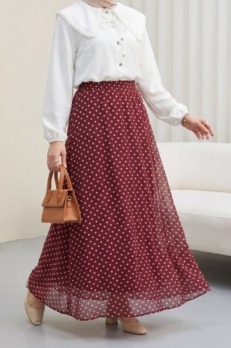 Puantiyeli Beli Lastikli Astarlı Şifon Etek Bordo