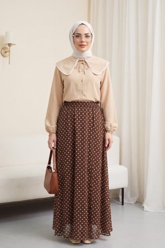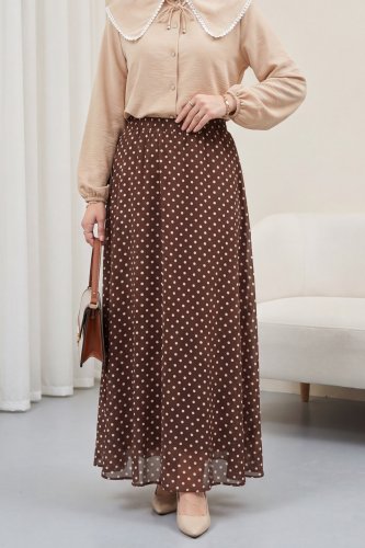 Puantiyeli Beli Lastikli Astarlı Şifon Etek Kahve